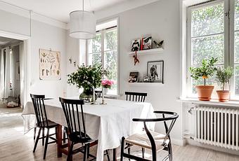 Nos encanta como han conseguido colar el exterior tan verde y frondoso en el interior de este salón nórdico. Ese ventanal con las macetas de terracota y arbolitos en la repisa de madera blanca, nos maravilla ¿a vosotros?