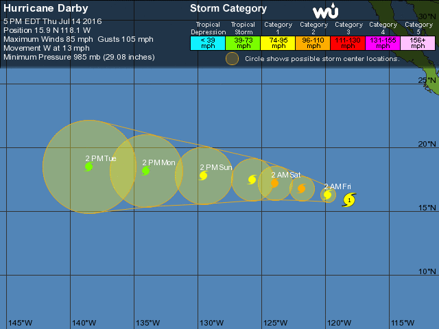 Lo más importante para destacar es que "Darby" seguirá aumentando su fuerza en las próximas 24 a 36 hs con un movimiento del Oeste, que lentamente irá cambiando al Noroeste y podría empezar a debilitarse hacia el fin de semana, ya que entrará en contacto con aguas de menor temperatura, según ha informado El Centro Nacional de Huracanes con sede en Miami.Otra información importante es que "Darby" no afecta ningún territorio ni tampoco lo hará en los próximos días.