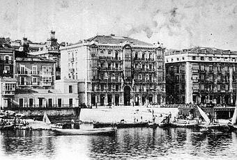 Finales del siglo XIX:Dársena de La Ribera, antes del relleno que finalizó en 1902,donde se construyeron los Jardines de Pereda.A la izquierda podemos ver el edificio de la Comandancia de Marina, a su derecha el Gran Hotel Francisca Gómez, hoy la parte derecha de la sede central del Banco de Santander y detrás se pueden apreciar las torres del Club de Regatas.