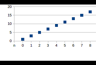 S_n = a n + b n es la variable que irá tomando valores {0, 1, 2, 3, ...} según pase el tiempo, mientras que a y b son números fijos cualesquiera.Tanto en la gráfica como en la tabla se ve que cada año la producción alimentaria se incrementa en una misma cantidad.