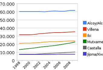 El primer gráfico contempla la evolución de la población total de estas seis localidades. Se aprecia que están ordenadas de mayor a menor población, orden que se repetirá en cada uno de los gráficos siguientes.Respecto a este dato se observa que Xixona y Alcoy apenas tienen crecimiento en estos últimos 10 años, mientras que Villena, Ibi y, sobre todo, Mutxamel experimentan crecimiento en términos absolutos.