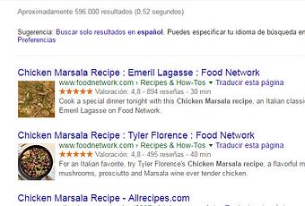 En el siguiente ejemplo vemos una lista de resultados de búsqueda en la que todos los resultados utilizan datos estructurados para mostrar una imagen en miniatura asociada a la receta, y además uno de los resultados utiliza las reseñas y valoraciones de usuarios, destacando frente al resto de resultados.