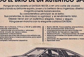 La vieja publicidad, al pie, menciona que la cupé Datsun 180 SX, al jueves 4 de diciembre de 1980 costaba 74.780.000 pesos ley. El valor expresado en dólares era de 37.768. El modelo figuraba en los listados de autos importados como Datsun 180 SX Cupé 3 puertas.
