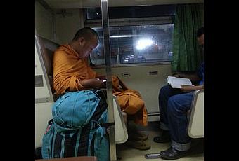 El tren es un vagón sin compartimientos, abierto, tipo la tercera clase del transiberiano pero aquí las personas se colocan en la misma dirección que el tren, no perpendicular, van de dos en dos y una vez las camas están hechas tienes cortinitas para proteger tu privacidad. Mira que majos estos Tailandeses. A mi altura, separados sólo por el pasillo tengo uno de esos cientos de monjes que he visto paseando por la calle o en los sitios turísticos. Es muy majo y me ha dejado colocar la mochila a su lado, incluso me ha ayudado a encontrar la litera cuando me ha visto entrar al vagón. ¿El problema? No nos podemos tocar ni darnos cosas directamente. No es que en mi lista de cosas pendientes tenga apuntado darle una barra de chocolate a un monje… ahora que lo menciono sí lo tengo pero es otro tema, no a este monje en concreto. Sea como sea no nos podemos tocar ni por accidente mientras el tren traquetea y nos balancea de un lado a otro y el tren, como todos los trenes, es muy estrecho. ¿Puedo dejar la mochila a tu lado? Sí, claro. Se levanta y da un rodeo de medio vagón para que ponga la mochila cómodamente. Desde la distancia me pregunta si no sería mejor que la atase. Le digo que es buena idea, la ato con las cintas, al levantarme le hago un “Wai” y me vuelvo a sentar en mi sitio. Él vuelve desde la lejanía a sentarse. ¿Qué es un Wai? No, no es un “Que guay es ser Tai” Es un saludo que consiste en levantar la manos con las palmas juntas como si rezáramos y acercándolas al cuerpo a la altura del pecho, mientras inclinas un poco la cabeza. Cuanto más eleves las manos más respeto muestras, la familia real y los monjes son los únicos que no hacen el Wai. Si tienes las manos ocupadas no se puede hacer un Wai así que te limitas a inclinarte.