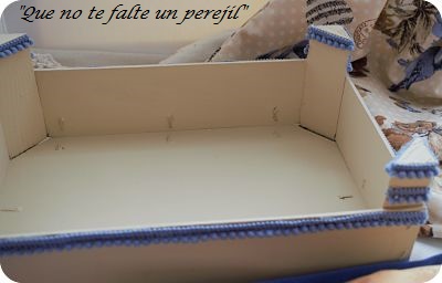 Primero, le dí dos manos de pintura, dejando secar entre una y otra capa. Alrededor pegué la cinta de borloncitos con silicona caliente.