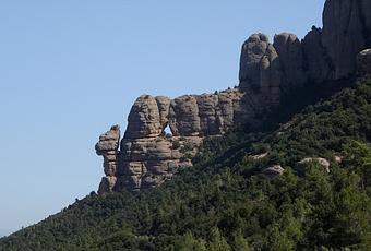 Cuando llevamos aproximadamente dos kilómetros tenemos ante nosotras la gran Roca Foradada y vemos una marca del GR en un árbol a nuestra derecha. En este punto hay que tomar el sendero que sube bastante empinado. Vamos subiendo haciendo zig-zag siguiendo el camino marcado. En algún tramo hay que para trepar un poco. En cuestión de unos 10 minutos alcanzaremos nuestro objetivo. Tenemos antes nosotros una magnífica panorámica hacia el norte con vistas a Manresa, Santpedor y buena parte del Bages y del Berguedà. Regresamos por el mismo camino.