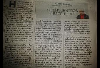 Vetusta Blues. –“De encuentros y escritores”Hace unos días tuve la fortuna de presentar la tercera novela del escritor canario Pablo Martín Carbajal “La felicidad amarga” ante un numeroso y muy atento público en la Fnac Parque Principado. Una vez terminado el carrusel de firmas y saludos, emprendimos camino para reunirnos con José Havel, crítico cinematográfico a quien conocen bien los lectores de este periódico. Paseando por las calles de la gélida ciudad los forasteros perciben y disfrutan de la belleza de una capital que rezuma literatura en cada una de sus piedras y edificios. Aproveché para recomendarle a Pablo una novela –densa, excelente- sobre Oviedo para salirnos del tópico de “La Regenta”: “Jugadores de billar” de José Avello.Durante la cena en la Nueva Cantina del Vasco, en torno a los peculiares chipirones a la sidra, el inevitable cachopo que el escritor chicharrero quiso probar, el queso de Cabrales y la sidra recordamos encuentros literarios y jornadas hoy en peligro por aquello de los recortes que se ceban siempre en la misma: la cultura. Le hablamos de las Jornadas Literarias de la Asociación de Escritores de Asturias en Pravia, de milagros como conseguir con un reducidísimo presupuesto a cinco premios nacionales de literatura. Y esos momentos emocionantes como el recital que tuve el honor de conducir con grandes poetas como Luis Alberto de Cuenca o el magistral Félix Grande, enamorado de las notas del piano de Jacobo de Miguel, que se intercalaba entre los poemas de una docena de escritores. Instantes y encuentros que reconfortan en el intercambio de ideas, de historias, en la humanidad y vitalidad que contagian a una labor solitaria y nada valorada en estos tiempos de brutalidad y mala educación. Y nos planteamos, pensando en voz alta, por qué no podía darse algo así en Oviedo, una iniciativa que ya tuvo presencia en la ciudad hace veinticinco años, en mayo de 1988, en los Encuentros Literarios 80, donde recalaron autores de la talla de Antonio Muñoz Molina, Luis Mateo Díez o Soledad Puértolas y que quedaron reflejados en una publicación que unos días después descubrí en una de las estanterías de la casa de mis padres.Encuentros necesarios para una ciudad donde la literatura se vive en jóvenes autores, como bien habrán comprobado quienes se acercaran durante el mes pasado por la plaza Porlier y contemplaran el interesante intercambio fotoliterario Objetivo Doble Dos. Oviedo es una ciudad musical y literaria, que necesita de estas convocatorias, de encuentros donde los escritores salen de sus mundos para hallar la dimensión humana con la que regresar, enriquecidos, a su mundo solitario de letras e historias.MANOLO D. ABAD