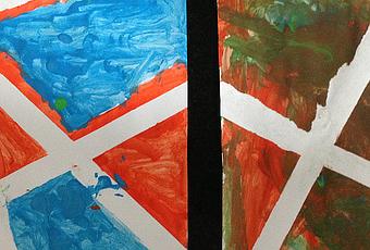 Los cuadros de la foto están hechos en folios normales y corrientes. No os lo aconsejo. Al despegar la cinta de carrocero, aunque no es lo mismo que un celo, nada más que por lo húmedo que queda el folio con la pintura se corre el riesgo de que se rompa un poco. Es lo que nos pasó a nosotros. Es mejor usar lienzos o cartulinas.