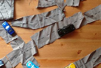 Lo primero que hay que hacer es cortar la tela de una pierna dejando a un lado las costuras verticales. Y se guardan para después. Con la tela ya cortada, está lista para usar. Tomamos como medida uno de los coches con los que más jueguen los retoños. Se usa el ancho de referencia y, a partir de ahí, se corta la carretera, con espacio para dos coches. Yo decidí cortar una carretera recta, otra con media curva, otra con curva de 180º y un cruce de cuatro (forma de cruz). De las rectas corté cuatro; del resto, dos. Luego sólo hay que dibujar los carriles con un rotulador. Ya están las carreteras. Más fácil imposible. Y eso usando sólo con las tijeras.
