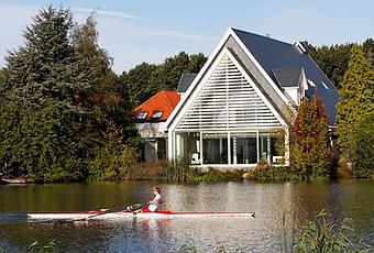 Otro ejemplo de reciclado arquitectónico en Europa, Una iglesia de 1930 junto a un canal navegable fue transformada en una casa moderna unifamiliar. En la fachada principal de esta casa moderna que da a la calle quedan características de la construcción original. La contrafachada se muestra al canal y es de aspecto Contemporáneo sin señas de haber sido un templo cristiano. El interior es donde mejor se aprecian la estructura y las ventanas propias de la función original.