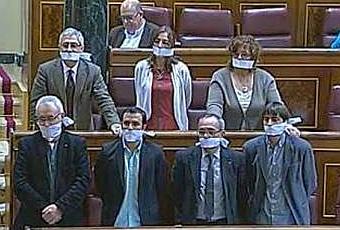 (Diputados de Izquierda Unida protestando contra la Ley Mordaza.)