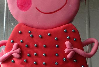 Para darle los toques finales a Peppa, usé rotuladores comestibles. Pero si no los hubiera tenido, habría optado por derretir un poco de chocolate blanco y teñirlo del color que necesitara. Después se introduce en una bolsita de cocina (con cierre zip o la de los bocadillos), se corta un poco la esquina y, a modo de manga, con mucho cuidado, se van dibujando los detalles.