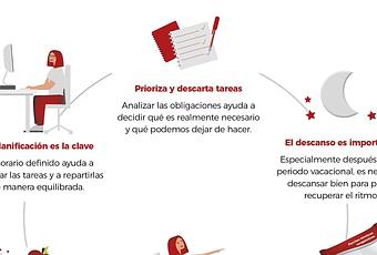 La planificación es la clave, según de la Serna. “Tener en cuenta con qué obligaciones deberemos cumplir a la vuelta y organizar el retorno a esta, dibujando un horario si es preciso, ayuda a visualizar los retos que se deben afrontar”, afirma. “Esta sensación de control genera una cierta tranquilidad y, además, también ayuda a repartir las tareas y responsabilidades entre todos los miembros de la familia de forma equilibrada, según las agendas de cada uno”.