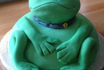 Lo que no os conté es que una de las pocas cosas que recuerdo del paritorio es que el gorro del anestesista tenía dibujos de rana. Así que me lié la manta a la cabeza y empecé a investigar tartas con forma de rana. Y así nació Juana. La idea no es mía, está sacada del libro Debbie Brown’s 50 easy party cakes, que aunque está en inglés, es fácil seguir por las imágenes.