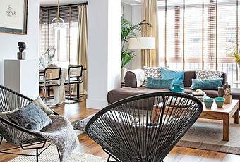 Textiles cĂĄlidos: cojines, mantitas, alfombras... son el puente perfecto para que el mueble “de terraza” no cante en el salĂłn.