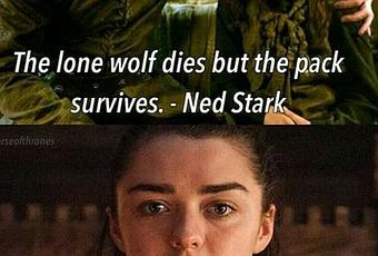 Recuerdo una carta de Magic, está, que decía que un lobo solitario es o un superviviente o un bruto. Aunque Ned Stark tiene su sentido cuando le dice eso a Arya, en el sentido de que están en territorio hostil o no amigo (Desembarco del Rey) y tienen que estar unidos (Que no riña con Sansa), lo que dice Arya, años mas tarde, cuando se encarga de los Frey es mas cierto y va en la honda de la carta de Magic, demostrando que tanto Frey como Lannister metieron la pata. Dejaron Lobos vivos que sobrevivieron sin la manada, volviéndose mas peligrosos.