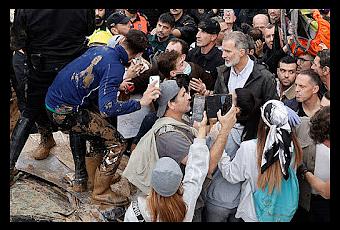 ¿Peligro? Como al cabo indica el resultado de ese largo contacto, de ese agitado convoy por las calles enlodadas, no era un riesgo imposible, que fuese causado por una mayoría peligrosa; sino el clamor de gentes devastadas y abandonadas, pues se avienen a escuchar a quién sí ejerce responsabilidad, aunque no sea el responsable. Felipe se gana en minutos no solo el sueldo, sino el reinado: ha sabido distinguir espontáneamente el riesgo encauzable de un peligro irreversible, y al afrontarlo de cara, sin escudos, ha ofrecido equilibrio. Ha ganado quizá más, el derecho a ser nombrado simple, amicalmente, por su nombre de pila y sin número de orden, como un predecesor al que, en sus momentos álgidos todos llamaban Juan Carlos. O simplemente, el Rey. Y otro tanto Letizia, minutos más tarde.