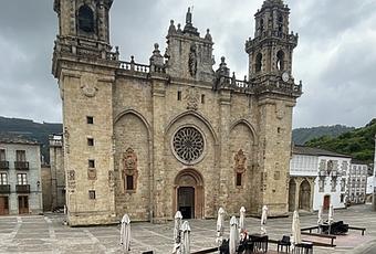 Cerca de Ribadeo, a 30 Kms, se encuentra Mondoñedo, que fue capital de una de las siete provincias históricas gallegas hasta 1833, patria de Álvaro Cunqueiro, maestro de la narrativa fantástica. Pese a su poder en otro tiempo, la pérdida de población ha sido un goteo constante. Como sucedió en Ribadeo, después de contemplar la imponente catedral, en cuyo interior se localiza el museo fundado en 1969, Juantxu se hace el longuis y se niega a dar un paseo por el pueblo. Ya sabe que yo no lo perdono. Pide una cerveza y se sienta en la terraza, para seguir contemplando la "catedral arrodillada", nombre con el que se la conoce, el templo madre de todas las iglesias de la diócesis. Como tardarán un par de horas en abrir algunos de los lugares que llevaba anotados en mi agenda, y tenemos que seguir viaje, decido hacer un recorrido por sus calles. Casas con tejados de losa donde se arman esos típicos picos de piedra o " ameas " para protegerse contra el viento. Hay un constante trasiego de peregrinos que hacen una parada en esta ciudad. Camilo José Cela, en su libro de viajes "Del Miño al Bidasoa" ya hace mención del caminante que va reflejando sus opiniones al pasar por Mondoñedo. Sirva nuestro ejemplo para corroborarlo.