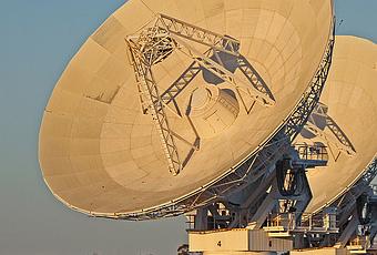 Imagen de las cinco antenas móviles del interferómetro Australian Telescope Compact Array a contraluz en la puesta de sol del 4 de agosto de 2011. Se trata de una composición HDR usando dos imágenes distintas. Crédito de la imagen: Á.R. L-S..