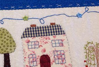 En colores blancos, azules y verdes, como los visillos que yo misma confeccióné. Unas sencillas aplicaciones, unas con festón y otras con puntada escondida.