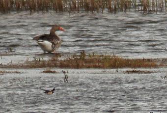 Primera parada en la charca de Gandarias donde entre silbones, cucharas y azulones, ha aterrizado un ganso despistado.