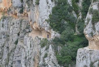 Llegamos ya a una buena altura con acantilados de importante altura y en los que, en algunas zonas, se han dispuesto pasamanos “quitamiedos”. Es ahora cuando comienza la parte del GR más espectacular, en la que nos adentramos en el Congost de Mont-rebei. Avanzamos por un camino estrecho excavado en la pared de la roca y de vez en cuando nos sentamos en alguno de los bancos que han dispuesto para disfrutar de las vistas.