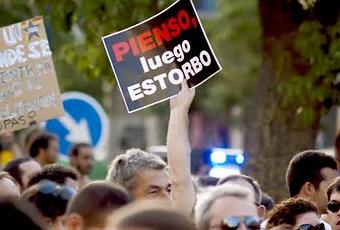 . Uno de los caminos es de la contestación y la revuelta permanente, la "resistencia-pasiva activa", el convertirse en un movimiento de "agitación social", dirigido fundamentalmente a promover entre la sociedad el boicot de todo aquello que se considere antidemocrático o perjudicial para la inmensa mayoría de la población. Por ejemplo: "los políticos no se preocupan del bienestar de los ciudadanos; usemos por lo tanto todos los medios legítimos posibles para poner de manifiesto en sus propias narices su falta de interés; boicoteemos con las reivindicaciones ciudadanas las reuniones de los consistorios municipales, de las asambleas autonómicas, del gobierno central, etc., etc., especialmente cuando se estén decidiendo cosas en contra de los intereses ciudadanos" (se trataría de acciones intermedias entre el "oso-antimoroso" que perseguía al alcalde de Madrid, las performances de Greenpeace, las madres de la Plaza de Mayo, y las megamovilizaciones ante el G-8, pero organizadas de modo constante y frente a todos los niveles de la administración). . O, por ejemplo: "los bancos y el sistema financiero explotan injustamente a la sociedad; boicoteémoslos, convenciendo a la gente de que saque su dinero de los bancos que no cumplan unos mínimos -o máximos- criterios éticos; o hagamos campañas informativas sobre los trapicheos de los que tengamos noticia". . O, por ejemplo: "el sistema actual no garantiza el acceso a la vivienda: organicemos un movimiento general de 'okupación' de viviendas vacías". . O, por ejemplo: "los empresarios aprovechan la coyuntura económica para explotar a los trabajadores: boicoteemos los productos de sus empresas". . O, por ejemplo: "las políticas de austeridad crean más miseria: agrupemos todas nuestras acampadas frente a la sede del Banco Central Europeo y frente a los domicilios de sus principales dirigentes, hasta convencerlos de que adopten una política monetaria keynesiana y empiecen a imprimir billones de euros con los que financiar los déficit públicos y las políticas de bienestar que se están reclamando" (y de paso, todos con camisetas con la cara de Paul Krugman). . O, por ejemplo: "el sistema educativo es una mierda: que los padres de los alumnos se pongan en huelga y no lleven a sus hijos al colegio hasta que haya soluciones verídicas". . Naturalmente, el problema de este camino es que, con toda probabilidad, sería seguido sólo por una proporción mínima de los presuntos indignados. La mayor parte de la gente, incluso de aquellos más persuadidos de que las reivindicaciones isidriles son razonables y justas, no asumirían el coste de estas acciones (ni se pasarían la vida de cacerolada, ni se atreverían a sacar el dinero del banco -si lo tienen, o lo que tengan-, ni dejarían de comprar, etc., etc.). Ello por no hablar del riesgo de que, a medida que sólo los más radicales se quedaran siguiendo este camino, emprendieran acciones cada vez más violentas. . . El segundo camino, que a mí personalmente me parece el más razonable y productivo, es transformar el movimiento 15M en un partido político creíble (aunque sea con todo el dolor de su corazón), que intente convencer a la gente de que las medidas que propone serán beneficiosas, y que las lleve a cabo desde dentro de las instituciones. . Al fin y al cabo, si el movimiento tiene unas reivindicaciones, se supone que a quienes éstas van dirigidas es a los partidos políticos representados en el parlamento, que es la institución que puede tomar la decisión de instaurar leyes que recojan aquellas reivindicaciones. Pero, ¿qué sentido tiene pedir, o "exigir", a un partido que vote por una propuesta que no figura en su propio programa electoral? Es más sensato presentarse directamente a las elecciones con dichas propuestas, y si es verdad que la gran mayoría de la población las considera suyas, pues lo expresarían así con sus votos, ¿no? . Naturalmente, los isidrines parecen pensar más bien que no. O bien no confían en que la gente votará en número suficiente a un partido basado en el movimiento 15M, o bien no confían en que el "sistema electoral" les dé "igualdad de oportunidades". Pero esto último es una falacia, aceptada tan sólo por el miedo a perder. Es cierto que los grandes partidos tienen cogidos por los huevos los mecanismos tradicionales de propaganda y "creación de opinión", pero si algo ha demostrado el 15M es que esos mecanismos tradicionales hacen aguas por todos los lados, gracias en gran medida a internet, a las redes sociales, y a ese tipo de cosas. . Otra cosa es el miedo a perder: ¡seguramente que no ganarán las elecciones! (al menos a corto plazo); pero incluso una pequeña presencia en el parlamento podría ser muy importante como vía para expresar sus reivindicaciones y a lograr parcialmente algunas de ellas, sobre todo allá donde se convirtieran en "bisagra". Al partido socialista le costó décadas conseguir un primer diputado, y más de un siglo llegar al gobierno (y mucho menos volverlo a perder). A los liberales británicos no les va mucho mejor. Pero carajo, en eso consiste en gran parte la democracia, en aceptar que tus reivindicaciones sólo tienen la fuerza de la cantidad de gente que las apoya con sus votos, y ni un miligramo más, por muy legítimas y autoevidentes que les parezcan a sus redactores. .