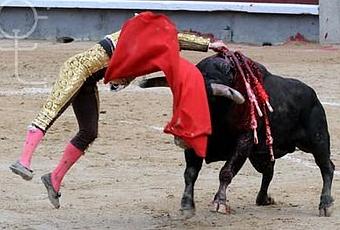 Arriba, Julipié a un toro del Ventorrillo, encaste bobo, lidiado en Madrid en la Feria del Aniversario. Tarde del 12 de Junio de 2010.