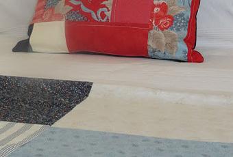 Se me ocurrió adaptar un tapete que les hice a mis padres hará dos o tres años con precortados en azules y rojos para la mesa de camilla. En nuestra nueva situación, pensé que una buena idea sería convertirlo en una mantita para ponerla a los pies de la cama de mi padre en su estrenada habitación.
