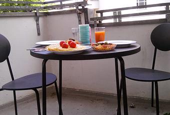 En la nuestra no hay sitio para tomar el sol pero sí para una pequeña mesa con unas sillas alrededor donde poder comer, sentarse para charlar, escuchar música etc. Estamos encantadas con ella y la disfrutamos un montón. Esta fue la comida del domingo pasado. ¿Adivináis el menú?
