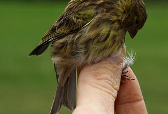 Fotos jornada de anillamiento científico abierto al público organizado por Ecometropoli, (Santa Coloma de Gramanet ) en el río Besós del día 7/10/2018: ♀ Serinus serinus. Verdecillo o Serín verdecillo . Gafarró. European Serin.Anillamiento dirigido por : Xavier Larruy