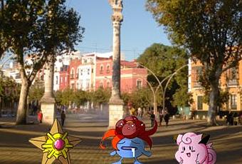 Foto: La Alameda de Hércules, ayer por la tarde. En la foto, de izquierda a derecha, nuestros Pokémon distintivos: el Staryu de Vientoblanco, mi Gloom y el Clefairy de Giz.