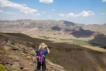La ruta transcurre por un camino de mulas; cruzamos parajes con grandes contrastes de color, desde valles verdes a montañas de colores rojizos. A partir de los 1.600 metros, la vegetación predominante está formada por grandes cedros y sabinas, algunos de éstos ejemplares son prácticamente milenarios. A medida que tomamos altura empezamos a ver el valle desde otra perspectiva. Delante nuestro divisamos, a lo lejos, el lago estacional de Izourar que visitamos la tarde anterior.
