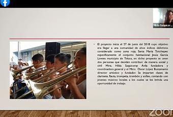 Asimismo, presentó su proyecto Banda Tradicional Infantil “Jesús García Olvera”, cuyo objetivo es llegar a comunidades con altos índices delictivos en la Ciudad de Toluca, particularmente en Santa María Totoltepec, donde imparten clases de clarinete, flauta, trompeta, trombón y solfeo, con jóvenes músicos locales a los cuales se les brinda una oportunidad de trabajo.