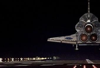 Aterriza el transbordador espacial Endeavour en la oscuridad de la pista 15 la pista de aterrizaje del transbordador del Centro Espacial Kennedy de la NASA en Florida. Crédito de la imagen: NASA / Sandra Joseph y Kevin O'Connell