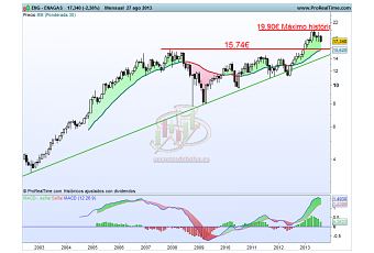 No hace mucho veíamos el gran momento por el que estaba atravesando Enagás en ese rally alcista que comenzó a principios del 2012 que le hizo alcanzar y superar el máximo histórico situado en aquel momento en los 16,30€ (ahora 15,74€ tras el reparto de dividendos). Tras romper ese nivel de precios que le situaba en un terreno nunca pisado el precio continuó subiendo hasta marcar un nuevo máximo histórico, los 19,90€.