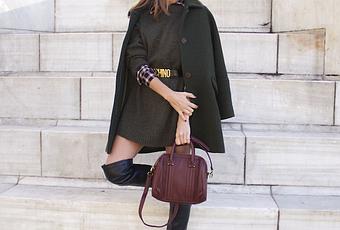 After this mini introduction as a ‘recap’ of my 2014 let’s talk about today’s look. I hope not being repetitive to you wearing again my new musketeer style boots but I like them so much, I wear them almost daily. So today I wanted to show you a new proposal with them. Once again I opted for oversize clothes and other color that I always use to wear in winter time: green in all its hues. I’m wearing a green jacket and a plaid shirt underneath with and oversize sweater on top. I put on a belt to adjust the waist sweater. As the checkered shirt is in black, white and burgundy colors I picked this shoulder bag in burgundy too.