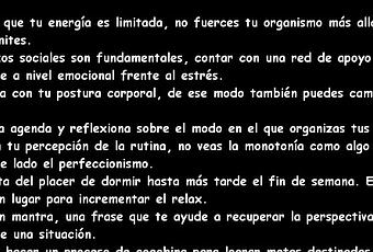- En primer lugar, debemos asumir de un modo natural que somos personas y no máquinas. Es decir, nuestra energía es limitada. Y no es bueno que nos acostumbremos a forzar nuestro organismo más allá de los propios límites. Recuerda que las mayoría de las cosas pueden esperar; tu propio bienestar, no puede. Es decir, tu salud es el bien más importante y debes cuidarla. En relación con tu salud, hay decisiones que debes tomar. Por ejemplo, aprende a decir no, para no cargar con una lista interminable de compromisos y responsabilidades que en muchos casos, tú mismo te has creado.