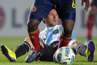 A diferencia del encuentro ante Bolivia, Argentina tuvo un mejor control de pelota en los primeros minutos. Las aproximaciones por la banda derecha de Ezequiel Lavezzi y -esporádicamente- Pablo Zabaleta preocuparon a los colombianos, quienes despejaron sin problemas cualquier balón que se acercase a su área. Las escasas llegadas de gol a favor del elenco nacional fueron un motivo de preocupación para Batista. Messi estuvo mucho más a gusto dentro de la cancha, aunque por momentos volvió a retroceder hasta el mediocampo. El juego asociado implementado por Argentina le permitió al crack del Barcelona poder asistir a sus compañeros: el más sobresaliente se dio en los últimos instantes del capítulo inicial, cuando habilitó a Lavezzi con un pase entre líneas, quien no pudo marcar el gol.