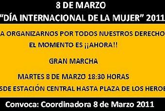 ¡ Invitación a la Marcha, Escúchala !Este 8 de marzo conmemoramos un nuevo Día Internacional de la Mujer, proclamado en 1910 en homenaje a trabajadoras textiles quienes, luchando por mejores condiciones de vida y laborales, murieron quemadas por sus patrones el año 1857. Siglo y medio después, las mujeres –trabajadoras todas-, en la casa, la fábrica, la cadena de producción, el servicio público o la calle, seguimos en pie de lucha por nuestras libertades y derechos que no se negocian.