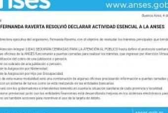 La flamante titular de la Administración Nacional de la Seguridad Social (Anses), Fernanda Raverta, decidió este lunes declarar como una “actividad esencial” el trabajo que lleva adelante esa dependencia oficial, con el objetivo de reanudar los trámites principales que brinda a la ciudadanía.