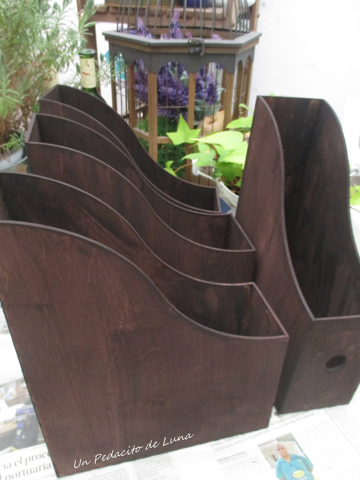 Me hice con unos cuantos archivadores del gigante sueco, de esos que vienen en madera natural y los teñí.