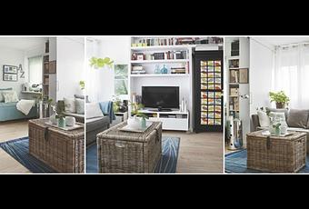 En la zona de comedor y living hay un baúl de mimbre chulísimo, y han decorado todo la estancia a su alrededor. Predominan los colores neutros, y para darle un poco de color algunos de los téxtiles, como la alfombra o las mantas son en tonos azules y mint.