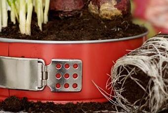 Si tienes en casa algún molde de bizcocho que ya no te sirve porque está muy viejo y se pegan las masas, no lo tires. Dale una nueva oportunidad y conviértelo en una maceta originales. Con un poco de tierra y unos bulbos puedes hacer un centro de mesa reciclado para tu cocina.