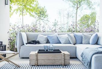 Esta casa, a parte de tener unas vistas de ensueño, una piscina que ya me gustaría tener a mi y un porche donde poder hacer comidas al aire libre, tiene unos grandes ventanales que dejan entrar mucha luz. Jugando con téxtiles en tonos fríos han conseguido romper un poquito con el blanco y mimbre que predomina en toda la casa, tanto dentro como fuera. Y algo que me ha llamado poderosamente la atención es que para darle un toque un poco más rústico al salón, han puesto un techo de madera. Creo que es la primera vez que lo veo, y la verdad es que el resultado me gusta mucho.