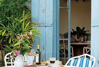 Inspirense con esta imagen, la puerta azul que recuerda al mar y al verano. la mesa de piedra blanca, con las sillas blancas enfundadas en unos textiles de rayas azules y blancas. La terraza, cobra protagonismo por la palmera enorme en colores vibrantes. En el centro de la mesa unas flores rosas haciendo el conjunto perfecto. Solo añadimos la botella de vino una buena compañía, y a disfrutar.