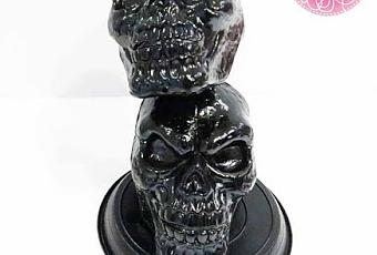 Cuando la pintura negra está completamente seca, vamos a pegar las calaveras en su base. Daremos la vuelta al plato de macetas y encima pegamos, con silicona caliente, las dos calaveras.
