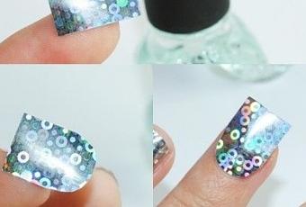 Necesitamos una cinta adhesiva con el diseńo y colores que prefiramos, esmalte de uńas transparente, tijeras y un poco de paciencia.