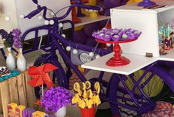 Prepara una fiesta multicolor con huacales y una bicicleta morada que no parara desapercibida por ningún invitado sobre todo si añades elementos personalizados como los dulces, letras 3D y recuerdos para los invitados