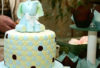 El pastel es uno de los detalles más importantes así que una opción es elegir un pastel de un piso cuya decoración tenga algunas imágenes de elefante. Otra opción es elegir un pastel de más de un piso con una decoración de fondant que permita recrear alguna figura en 3D de elefantes.